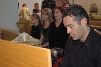 Midskips de Herfoarme sieten wy yn de dwerssteande frouljusbank. Heit altyd achter ús.