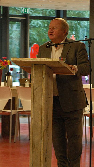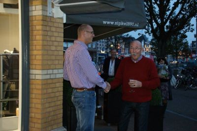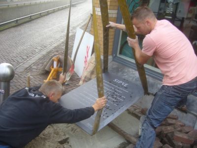 Na de stienlêging bin ik naar hús gaan om mij in alle stilte foar te bereiden op myn toespraak tidens de plechtechhyd fan Leo Poiesz syn kremasy. Dy toespraak hew ik an ut begin fan de middach houden in ut krematoarium de Schoterhof. Ut was goed om te doën, mar dit is nyt ut plak om hier ferder over te skrieven. Nyt allienech de family ferliest met Leo un bysonder mins, ok in de stad is ut stil nou’t Leo nyt mear onder oans is. Mar fergete salle we hem noait. Na de plechtechhyd kregen we dan ok koffy met…un Broadsje Knak! Fanavend dan de ( her-) opening en de ontbloating fan de poëzystien foar ut pand fan SIPKE-1890. Ut jaartal geeft ut oprichtingsjaar an fan de firma. Un groate ear om foar dizze ouwe Sneker middenstaansfamily un fers te skrieven dat nou in Belgys hardstien ferankerd is. Moai was ut dat de buurman en learmeester fan Sipke Dijkstra , Wouter Zandstra ( ‘ fan de skaatsen je ’ ) anwezech was. Haf gaf nòch un heel dúdelek ekonomy-leske. “ Sipke en Eddy, ut is nyt su moeilek om goëd saken te doën. Je mutte altyd duurder ferkope as wêr’t je ut foar inkocht hewwe. Teugenwoardech binne der tefeul ondrnimmers dy’t de begrippen in- en ferkoop deur mekaar hale en dan komme je in de problemen! ”