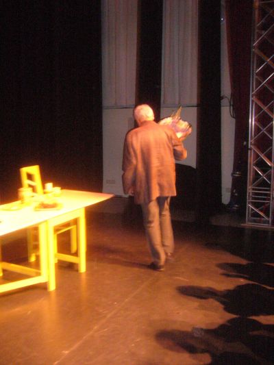 Tòch kwam ut gisteravend allemaal heel dichtbij, letterlek en figuurlek in dit prachtege festje-búze-teater fan Sneek. Ik hoorde de ouwe man puffen en stinnen bij ut skoënfeteren! De Goudfisk is ok de histoary fan un dòrp, fan de dingen dy’t foarbij gaan. Fan ut plattelaansleven, un Sneker met syn kleinstedelek denken ok nyt freemd. De ouwe man op ut poadium houdt ut klein, houdt ut herkenber. “ In âlde man is mar in neatich ding! ” Ut ferhaal speult um ou in un húskamer dêr’t alles brún is, tòt ut earpelskilbakje en de fluitketel an toe, behalve ut koffykòpke fan Houkje dat wit is. Moai fon ik ut stukje monolooch over leeftyd. Foar jonge minsen gaat de tyd noait rap genoech, ouwere minsen ( mar wat is oud ? ) toffele achter de tyd an. Dat de ouwe man op opfallende rútsje-motyf-pantoffels beweegt krijt in dat licht un demênsy mear. Dizze ròl fan ouwe man is Gratama op ut lief skreven, hoe’t hij beweegt, hoe’t er siet mar ok hoe’t hij der út siet, wat um bezech houdt. “ De minsken tinke dat ik homo bin, mar dat is net sa. Ik bin op in leeftyd dan kinne je út alle kasten komme, mar út de kiste komme je net ! ”