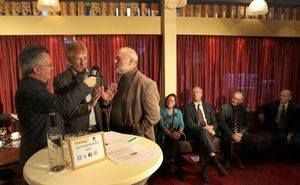 In myn toespraak had ik met foar bedachte rade un stukje opnomen wêrin’t ik foarstelde dat Apotheker us un serenade an Heabeltsje brenge sú. Seuven avenden bleef dat fersoek onbeantwoard, mar gisteravend was ut dus raak. Un doadsenuwachtege Hayo Apotheker ( ‘ ik had me toch een stuk spanning…’) betrad ut poadium onder applaus fan de stampfolle saal, om der na ut optreden met un ovasy wear ou te gaan. Met andere woarden Sneek het Apotheker in de armen sloaten op un onfergeteleke manier. Heabeltsje de Jong wurdde der súver emoasjonaal fan.
