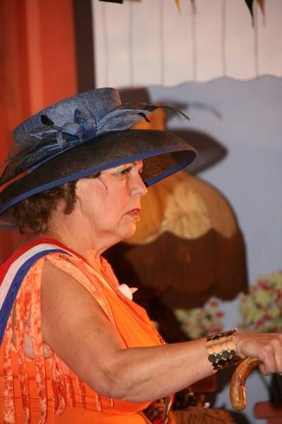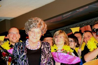 Waterpoartster en earegast Greetje Slippens-Poiesz geniet met folle teugen fan ut optreden fan Hayo Apotheker en Kees Poiesz.