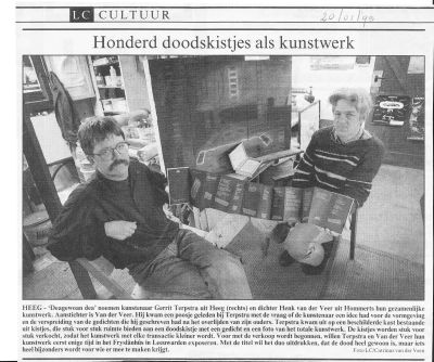 Op un hele kreatieve manier lope Gerrit Terpstra en de gemeente Wymbritseradiel foarút op de herindeling. Gistermòrren is in de hal fan ut gemeentehús fan Wymbrits de tentoanstelling ‘ Ut’e tiid ’ fan beeldend kunstenaar Gerrit Terpstra opend. Der hangt un groate fyts met fleugels, dy’t symboal staat foar ut wechfytsen fan de gemeente met de groëne greiden en de witte seilen ’. In de loop fan ut jaar sal de tentoanstelling allienech mar groeie met andere objekten fan Terpstra. Ik hew al jaren un groate bewondering foar de Hegemer kunstenaar, hij maakt nyt allienech prachtech werk, ut is ok nòch us un prachtmins dy’t anderen kear op kear an ut denken set. In 1994 hew ik tegare met Gerrit ut projekt ‘ dea-gewoan-dea ’ útfoerd. Un houten sigarekistje met dêrin un deur Gerrit fòmrgeven swart harmoanikaboekje met 9 fersen fan mij. Ut harmoanikaboekje sit tussen twee berkenhouten plankjes klemd. Berkenhout omdat de berk ut symboal is fan levenslust. Fersen over de doad tussen levenshout fongen.