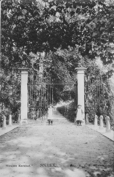 Tsja...ut staat tòch écht op de ouwe ansichtkaart fan de firma R.v.d.Meulen út Sneek. Ik fyn ut un intrigearende kaart, nyt allienech deur de naam Nieuw Kerkhof, mar ok de twee meiskes foar ut monumentale toegangsstek. Iederéén in Sneek weet dat ut Oud Kerkhof om de Groate òf Martinikerk is. Dy naam is niks mis met, want ut was de doadeakker, ut hof om de kerk. Mar om de Algemene Begraafplaats ok KERKhof te noemen klopt úteraard nyt. Ommers der is bij dit plak gyn kerk te bekennen. Oait lang lang leden lach der op dizze lokasy un kloaster, ut kloaster Hospitaal fan de Johannieters. De Hoge Brugge ( dy't ok al lang nyt hooch mear is ) over de Franekerfaart hyt offisjeel dan ok de Hospitaler Brugge. Ut was arsjitekt J.P. Rollema dy't in 1827 de opdracht fan de gemeente Sneek kreech om wat nou dan hyt de Algemene Begraafplaats an te lêgen. Dat moest búten de stadswallen gebeure in ferbaan met hardnekkege infeksysykten su as de goalera. Sneek was dêrmet één fan de earste gemeenten in oans laan dy't un nieuw begraafplak búten de stadswallen anlei.