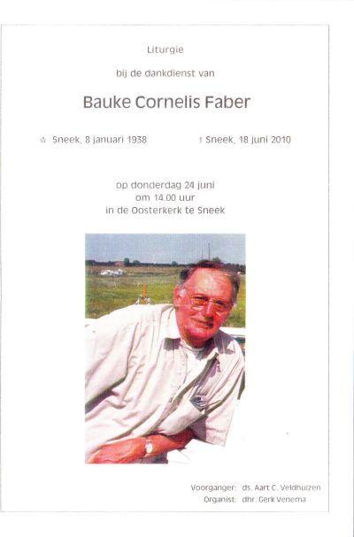 Un markante ONS’er is nyt mear: Bauke Cornelis Faber geboaren op 8 jannewary 1938 te Sneek, overleden op 18 júny 2010 te Sneek. Fanmiddach hew ik bij de dankdiënst fan Bauke weest. Un bysondere diënst omdat Bauke ok un bysonder mins was. Bauke, soan fan kachelsmid Ulbe Faber fan de Wijde Noorderhorne, het syn hele leven in Sneek woant òf su at syn frou Tiny Faber – Ybema ut treffend sei ‘ Bauke sat met un stuk elastyk fast an de Waterpoart ’. Ut deed mij as ONS’er goëd dat de foarsitter fan oans fereneging, Harm de Wagt, Bauke Faber recht deed deur in de diënst un kort IM út te spreken. Dizze sosjalistise foarsitter weet hoe’t ut mut: over grênzen heen stappe at ut noadech is. Ik bin wiis met dizze praeses! Myn moaiste herinnering an Bauke Faber gaat terug naar begin jaren seuventech toen ik as júniòr wel us metdoën mocht in un roemrucht O.N.S. team ( Ut Fijfde/Sesde/Seuvende ? ) wêr’t Bauke ok in speulde. Na ouloop fan su’n wedstryd bij de feteranen mocht ik ok an de stamtafel sitte. Dy mannen spuiden der nyt in en kear op kear wurdde der un rondsje besteld. As arme student had Bauke wel in de gaten dat ik su’n rondsje noait betale kon, mar hij liet dat nyt merke. Op un gegeven moment gaf hij mij onder de tafel un briefke fan 10 òf 25 gulden en flústerde de fanachter de haan: hiero! Om ferfolgens lúdop te brullen ‘ Van der Veer is nou an de beurt!!! ’ Su’ks fergete je noait wear.