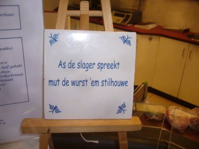 Slager de Rapper in de Krúzebroederstraat is un poëtys man. Wat hyt! Tussen alle karbo's en speklappen staat sumar un moai Delftsblau tegeltsje met un prachttekst in ut stads. Nou ja, dan kan myn dach al nyt mear stukken.
