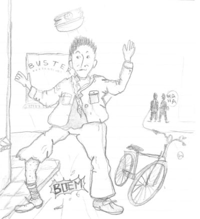 Pure baldadigheid, die door de hotelhouder aan de overkant van het plein gesignaleerd werd en aan de politie doorgegeven. Die kwam dan ook, in Daf en VW. Hi ha happening. De sterke arm ging uiterst rustig en lankmoedig te werk en verdreef het groepje, tot tevredenheid van de hotelhouder, die zich weer bij zijn lustig "Bye bye blackbird" zingende gasten voegde. Later zou het dan gebeuren op het kruispunt bij de "Pan-bar". Hi ha happening. Het bleef beperkt bij kinderachtig agentje-pesten. Voor enige hilariteit zorgde een wat ouder, maar zeer militant en giftig echtpaar, dat om de haverklap trappen en klappen aan de jeugd uitdeelde. De politie maande de echtelieden voortdurend tot kalmte, maar de man verklaarde dat hij voor de politie ook niet bang wat en zou bijna met de heilige hermandad op de vuist.