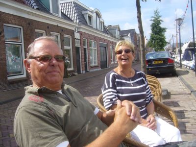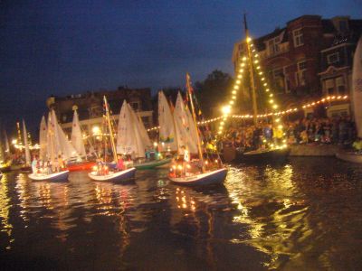 Op de Koopmansgracht binne de dingen ok al in gereeedhyd brocht. Gerard de Jong ( Bertus út de Bonte Sneker Avend ! ) sit met syn frou Atty al klaar. “ Gaan sitten wat wústou wete?” Alles! Nou dat ‘ alles ’ binne 25 keurech ferfde groëne palen. 500 meter kleurege flagjes en un lading lampkes dy’t fanavend foar de feeërike ferlichting sòrge mut. “ Dy lampkes hale we één foar één út ut doaske, draaie se één foar één in de pitten en fier dagen later in de omgekearde fòlchòrde ”, seit Gerard met un groate smile. “ We òrganiseare dit met de buurt. Eén kear per jaar un bbq dy’t de minsen self betale mutte, ik loof 12 euro fyftech en dan krije we ok nòch 150 euro subsidy fan de gemeente. Nou su hewwe we dan un pòtsje wêr’t we dit út betale. Atty beheart trouwens de Rampepòt. Ja, betale we ok de bloemen foar bij geboartes en overlijden…”