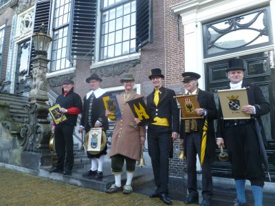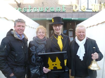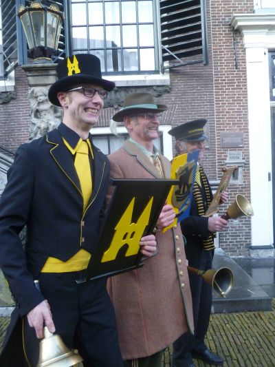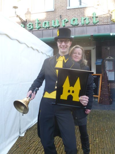 Toen kreech de sympatieke Sneker groënteboer ok wear un bitsje kleur op’e wangen. Want op ut moment dat de stadsomroeper nòch un bitsje onwennech in syn prachtege habyt Hotel De Wijnberg útkwam sach hij su wit as un doaien-één. ‘ Is gesonde spanning je, ut komt aansens helemaal goëd!’, liet hij ut públyk wete. En ut kwam goëd! Ruggesteund deur syn fader, de stadsomroeper fan Drielst en nòch un antal kollega’s ging Jan Sjoerd der plat foar.