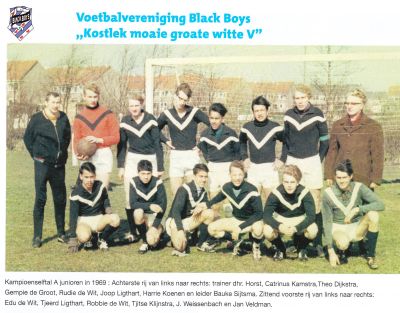 -Omdat ik un prachtfoto sach in ut nieuwe spòrtblad ( Sport in Sneek ) fan oans stad. Un kiekje fan ut roemruchte Black ( = Blak ) Boys 1 A, met allemaal ' jonges ' út'e Noarderhoek. Un feest fan herkenning fan jonges in ut moaiste foetbalshirt fan Sneek! Dêrom is dizze dach su moai!