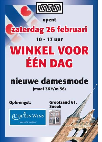 De eigenaar van Grootzand 61 te Sneek stelt zijn pand gratis ter beschikking Wat kunt u in de “winkel voor een dag” verwachten? Een breed assortiment nieuwe damesmode maat 36 t/m 56. Sorry heren voor jullie geen nieuwe outfit maar wel een lekker kopje koffie en voor de kinderen een attentie. De opbrengst van de verkoop gaat volledig naar Doe een Wens.