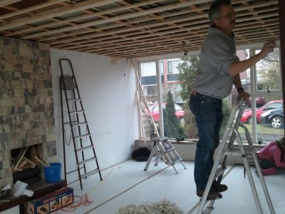 Tuurlek binne dy boufakkers ok wel un bitsje poëtys, at je der mar ooch & oar foar hewwe. Ik mocht fandaach in de buurt fan timmerman Anne Visser weze. Sinds 2009 het Anne syn eigen klussebedrief ( un ander seit wel ‘ bedriefke ’ hew ik um foar houden, mar dat tersijde). Nyt allienech bivakeare in de buurt fan de klusmaestro, ik mocht selfs even un boarmasine fasthouwe, om skroeven in ut gipsplaten plafòn te jensen. De earste de beste skroef ging úteraard su bryk as’t mar kan. Mar in plak fan nòch un kaans, gaf timmerman Anne mij nòch twee kaansen. Hew ik met beide hannen angrepen., teminsten ik hew krekt deen asòf. Mar teruch naar de poëzij onder boufakkers. Anne singt de gòdgaanse dach Nederlaanstalege teksten, foar un gedeelte simpelwech lutten fan artysten as Jan S. en de dry Jees. Foar un ander gedeelte selfbedochte teksten op bestaande melodytsjes. Dy laasten hewwe myn foarkeur. Dat fyn ik dus pure boufakkerspoëzy. Ut meast poëtise fan timmerbaas Anne fyn ik de naam fan syn eigen site: VISSER TIMMERT! ( http://www.vissertimmert.nl ) Kiek dat is nòch us ferrekte orizjineel. Anne was wel su earlek om toe te geven dat syn frou de naam bedocht het. ‘k Hew um beloofd dat ik dêr ferder nyt over prate sú. Over skrieven hewwe we ut fandaach nyt had. Der binne ommers feul belangriker dingen in ut leven fan un boufakker! Ik snitter nou dat ik in de tobbe gaan, ut is tòch wat om us écht an ut werk te mutten.