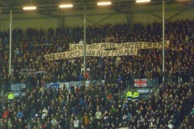 Never noait sal ik ut in myn harses hale om fijf minúten fan tefoaren foar ut beëindegen fan un wedstryd ut Abe Lenstra Stadion te ferlaten. Ik bin un toeskouwer fan ut raangebeuren. In de laaste minúten òf flak na de wedstriden gebeuren faak de moaiste dingen. Foarege week was ut befoarbeld Mika Värynen dy't na dy freeslek beroerde pòt foetbal teugen FC Grunn moedersiel allienech un eare ( ? )- rondsje liep om ut overbleven públyk te bedanken. Groate klasbak dy Mika. Gisteravend was flak foar de anfang fan de wedstryd teugen N.E.C. su'n moai oppertúnistys moment toen de harde kern fan Nieuw Noard un groat spandoek útrolden: LIEVER NOG MEER SPORTIEF DRAMA. DAN EEN SPITS IN EEN AJAX-PYAMA! ( sien foto gisteravend )