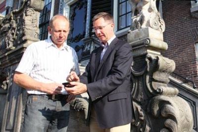 Paul van Goor, direkteur MYRIADM, geegt útlech an wethouwer Leo Pieter van der Stoel over de app