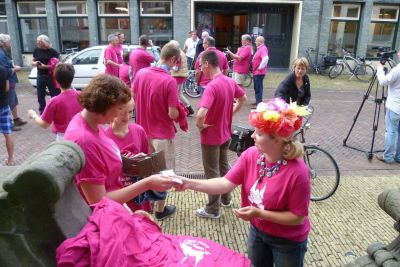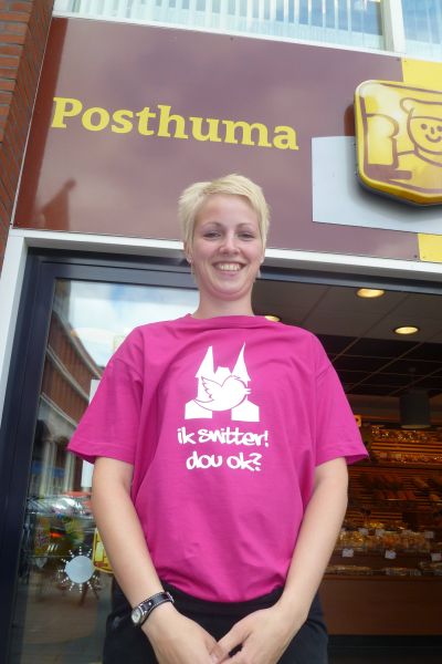 Su metien om 10.00 uur sal Maria Poiesz, foarsitter fan de stichting, un Beltsjebloemkleurech Snitter T-shirt in ontfangst nimme foar de kamera's fan GPTV.