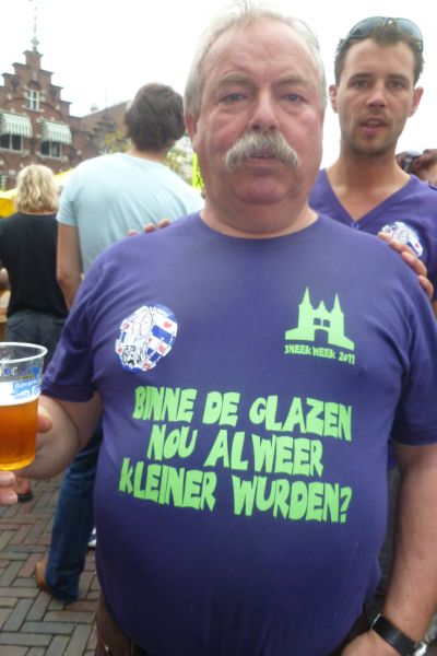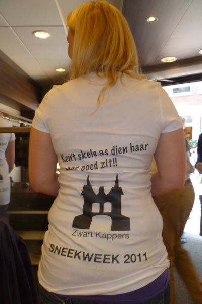Helemaal in styl, met nyt te min an hemelwater, hewwe we as Snitteraars gisteravend Sneekweek 2011 ousloaten. De Marktstraat lach der troasteloaser as troasteloas bij. Nòch één kear kwam ut water met bakken naar onderen, krekt tussen 19.50 en 20.15 ut moment súprême om ut su mar us plastys út te drukken. Mar dappere Snitteraars late sich nyt ferkatse deur barre wearsomstandechheden. Foto-shoet is foto-shoet. Heleen Sonnenberg was der met un fraaie sakflakkon Snitterbitter, dy't fandaach al bij De Weduwe te koop is. Fan elk ferkocht fleske gaat der één euro naar un fòlgend goed doël. De opbrengst fan de Snitter T-shirts het definityf € 1250 opbrocht. Foarwaar un prachtech resultaat foar de Stichting Aangepast Zeilen Sneek. Binnenkòrt nim ik komtakt met Maria Poiesz op foar de overhandeging. Ok gisteravend wear feul andacht fan de provinsjale media. Jaja ut is komkommertied eekmiegers, wij as Snittereaars beseffe dat oans terdege! Resultaten fan fotograaf Simon Bleeker binne fanmiddach te sien in de LC en ut FD. Nou earst even oustaan fan ut snitteren, overdaad skaat seit ut spreekwoard. Nou ok wel even genoech fan de Sneekweek en met al dy ferregende toeristen hew ik ut ok wel had.