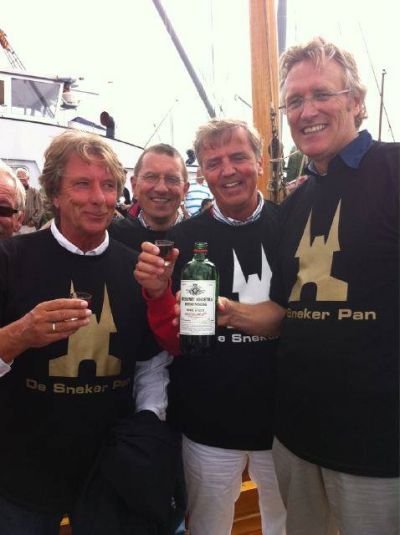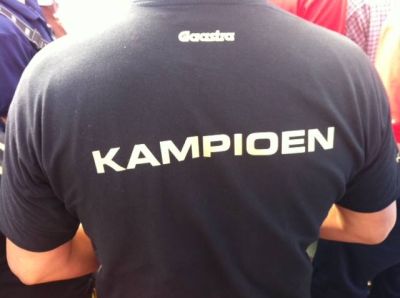 Wat un spontaan feest fanmiddach, earst wurdde de kampioënen massal toesongen bij de Waterpoart, tidens de intòch op ut skútsje. Dêrna in optòcht achter de Putkappel an richting Marktstraat. Op ut bòrdes opnieuw un huldeging deur un paar honderd Snekers. In de Stadhústún de ene lòfrede na de andere. Deur burgemeester Hayo Apotheker, Cor Reijenga ( St. Sneker Pan ), Karst Doevendans ( foarsitter Dicky van der Werffonds ) en Herbert de Vries ( foarsitter VSZ ). En de sprekers kwamen nyt met lege hannen, un paar prachtege cheques foar ut onderhoud fan de Panne! En...foar elk bemanningslid un fleske SNITTERBITTER fan de Weduwe!