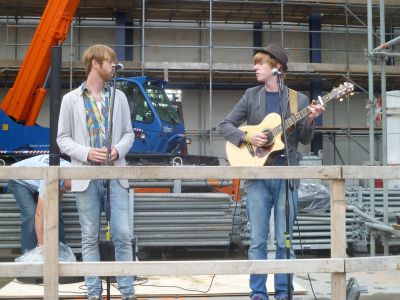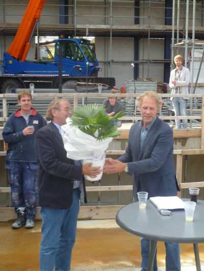 Eén beeld miste de wethouwer wel en dat was de meiboom op het dak. As kompensasy had Sinnema self mar un alternatyf boomke metnomen dat hij an projektleider Luiks overhandegde. Dêrna was der múzyk fan die Twa ( ? ) en spesjaal foar de boufakkers was weareldkampioën moanfluiten Geert Chatrou optrommeld foar un eksklúsyf konsert. Un bysondere middach foar wie’t der bij waren.