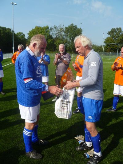 Un toepaslek ouskeidskado út Sneek: un slukje fan de Weduwe Joustra foar Durk de Jong út hannen fan De Man fan Staal, dy't earder al ouskeid nam fan de foetballerij, mar as stand in keeper tòch nòch even deur gaat!