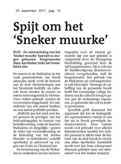 Apotheker kwam dêrna met un glashelder antwoard. “ De gemeente Súdwest- Fryslân heeft simpelweg behoefte aan ontvangstruimten. Dagelijks ontvangen wij mensen in onze nieuwe grote gemeente van 80.000 inwoners. Die willen wij in representatieve ruimtes voor de gehele gemeente SWF ontvangen. Daar past dus niet un Sneker Muurke bij, waarbij mensen herinnerd worden aan alleen maar Sneek! Wij zijn in Sneek het bestuurscentrum voor de gehele gemeente SWF. Zo zit het en niet anders. Dat jij opmerkingen maakt over de 10.000 euro die het Muurke minstens gekost heeft, begrijp ik, maar op een begroting van 200 miljoen is dat een schijntje!”