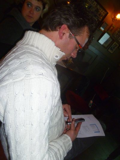 Mark Kooij ( dj Keu ) leest fersen foar fanaf syn telefoan...