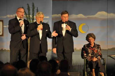 Omrop Fryslân presentatòr en sanger Douwe Heeringa in gesprek met Margryt de Vries, op'e achtergroan strak in't pak Wim Walda fan Groot Sneek.