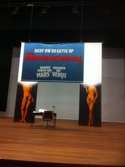 Teaterpúblyk twittert minder as foetbalpúblyk. Skynber falt der in un teater mear te beleven as op un kouwe foetbaltribúne op de earste desemberdach 2012. Fanmòrren sien ik de earste tweets foarbij fliegen ( twitter is tòch ut witte fogelstje?! ) over Huub Stapel syn programma Mannen komen van Mars, vrouwen van Venus.