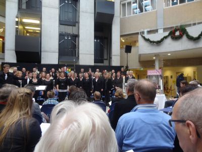 Fanmòrren bij un spesjale kerstdiënst weest, òf eigenlek un diënst op un spesjaal plak: de sentrale hal fan ut SINT Antonius Sikenhús in Sneek. Dêr trad gospelkoar Signalen op foar un groate groep fan anwezegen. Ds. Sijbren Poelman, geestlek fersòrging, had de foargang.
