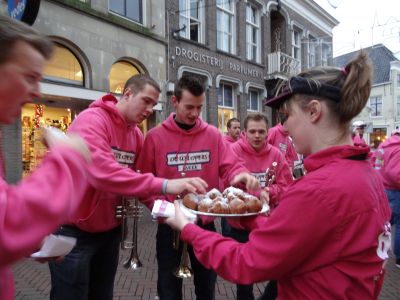 Ut tradisjonele fatenlege is nyt un eksklúsyf Sneker gebrúk, ut gebeurt overal in ut laan. De Sneker útlopers waren fanmiddach al onderwech naar Ludiek om dêr dizze tradisy lúster bij te setten. Op ut Oasterdyk earst nòch even un tussenstòp foar bij Bakker Bart, dêr't de hearen un skaal met oalybollen kregen foar hun múzikale bijdrage. Un goeie fette boaiem is ut halve werk!