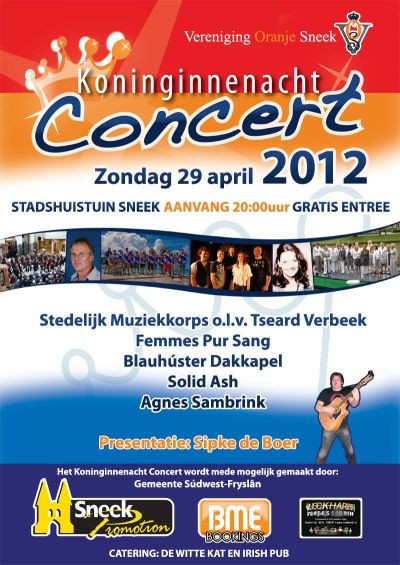 Op 29 april organiseert Vereniging Oranje Sneek, Gemeente Súdwest-Fryslân en Sneek Promotion i.s.m. BME Bookings en Eckhardt Professioneel voor de 9e keer in de Stadhuistuin te Sneek het traditionele Koninginnenacht Concert. Aanvang: 20:00 uur en vrij entree.