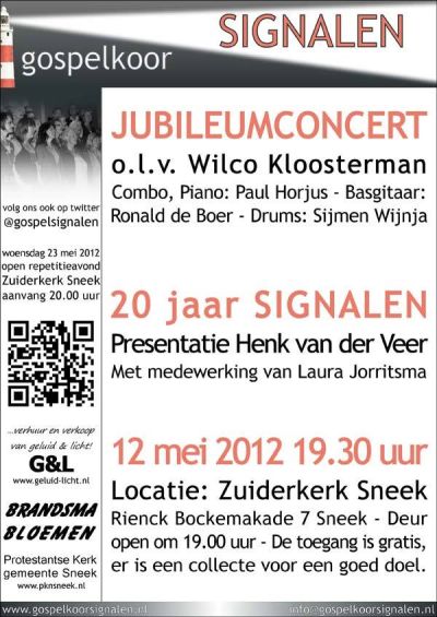 Ter gelegenheid van haar twintig jarig bestaan geeft Gospelkoor Signalen uit Sneek op zaterdagavond 12 mei aanstaande een spetterend jubileumconcert. Sinds het vijftienjarig bestaan heeft het koor een behoorlijke ontwikkeling doorgemaakt. Met de huidige dirigent Wilco Kloosterman, een pianist ipv van muziekbanden zijn de optredens veel levendiger en gevarieerder geworden. De kleding van het koor wordt regelmatig aangepast en op het jubileumconcert zal de nieuwe kledinglijn worden gepresenteerd.