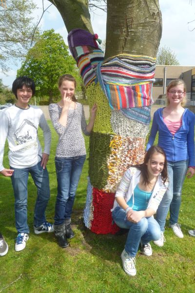 Wie’t nou over de Hemdyk komt, siet un antal bomen dy’t kleurech en fleurech inpakt binne met breiwerk. In de skoal staat selfs un fyts dy’t met breiwerk bekleedt is. De learlingen hewwe sich sponsòre laten per breide meter. Fandaach is ut projekt oulsloaten en wurdde un bedrach fan € 7281,76 overhandegd an Frysas! Hulde foar de learlingen en de òrganisasy!