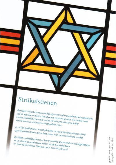 De site http://www.sporenjoodslevensneek.nl is online! Un hele bysondere webstek dy’t ontwikkelt is deur MyriadM fan Paul van Goor. Groate frou achter dizze site is Marrit Nijboer, dy’t dan ok alle lof ferdiënt! Ik kan nou wel un hele soad over dizze site skriëve, mar ut is feul beter om der self mar even naar toe te surfen. Mòrren wurdt de eksposisy Sporen van Joods Leven in Sneek opent in un spesjale bijeenkomst. Dizze opening is foar iedereen frij toeganklek. Wethouwer en lokoburgemeester Leo Pieter Stoel sal un openingstoespraak houwe en ok Rabijn Tamarah Benima sal an ut woard komme. Ik mach twee fan de elf fersen dy’t ik spesjaal foar dizze eksposisy skreven hew foarleze. Naast de site is der ok un heel moai boekje, fersòrgt deur MyriadM, ferskenen. Ik denk dat ut mòrrenmiddach un bútengewoan moaie bijeenkomst wurde sal. Fan harte welkom!!