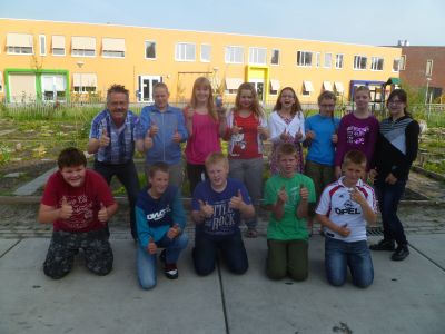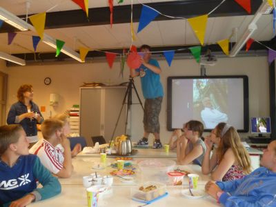 Uteraard bin ik dêrom fanmòrren mar op myn fytske stapt om dizze ferrassing in ontfangst te nimmen. Ankommen op skoal, ston ut ontfangstkommité al klaar, prachtech in de ‘ mooie kleren ’. Tegare met myn kollega Hans, dy’t frijdachmòrren myn coachgroep waarnimt wurdden wij naar oans lokaal toebrocht. De hele klas met kleurege ballonnen en flagjes fersierd. ‘Hebben we gistermiddag gedaan, wel tot 4 uur op school gebleven…’