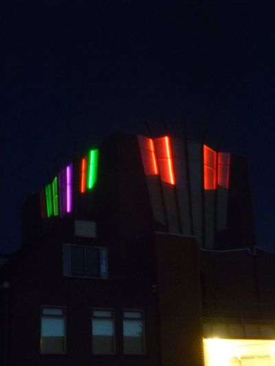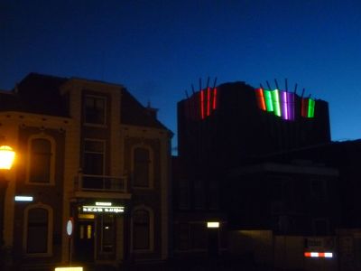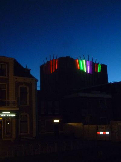 Hierbij! Sukrekt dizze foto's maakt fan ut nieuwe Teater an de Westersingel. Siet der futuristys en feeëryk út bij oans in de achtertún!! Twittergoeroe Wopke het ut over DISKO!! Mar dan wel un ferrekt moaie disko! Earder op'e avend sach ik al groate modderbulten op ut dak fan ut Teater.