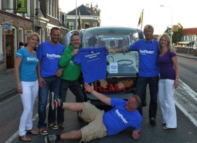 Nico Altenburg, één fan de tientallen Shuttle-frijwilligers, is ok drager fan ut Hufter Sneekweek T-shirt. De aimabele Sneker frijwilliger parkearde gisteravend de elektise shuttle graach even over de ingang fan Café De Kroon om ut shirt te promoaten!