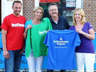 De Snekers Paul Harog en Eric Jongsma setten ut merk op’e merk: Hufter Sportswear! Foarech jaar namen Hendrika Terpstra, Mirjam Klein Swormink en ‘ Ka Pé ’ de Jong ut izersterkte merk over. ‘We hope der heel ryk met te wurden’, seit ut trio met un fette glimlach in koar. Gisteravend was de anbieding fan hun nieuwste produkt, de hagelnieuwe Sneekweek 2012 T-shirts en hooded sweather met de opdruk: Ut Snitserleven Gefoël! Moaiere tekst is amper foar te stellen, tweetalech nòch wel in ut Frys, Snitser en in de taal fan de stad. De foarech jaar flak na de Sneekweek feulste froech overleden Willem van Netten mach as ‘ eigenaar ’ fan de kwote sien wurde. Dizze groate roerganger fan o.a. de Bonte Sneker Avend, sú bearetròts weest hewwe at hij al dy blije gesichten gisteravend sien had bij de offisjele overhandeging fan de bysonder kleuurrike tricots. Dat ik nou krekt dizze Sneekweekgadget in intfangst nimme mocht, het te maken met de taalkundege advizen dy’t ik gaf. Skriëve je gefoël nou met òf sonder puntsjes òftewel un trema op de letter e? Met dus! En de earlekheid gebied ok te sêgen dat un bitsje pr foar Hufter ok noait wech is en dy geef ik dizze jonge ondernimmers graach. Dat doët Fons fan Café De Kroon ok graach, dizze Sneker horekaman in hart en nieren stelt syn etablissement graach beskikber as ' kantoar ' fan de Hufter-compagnie! ‘ We hewwe hier al heel wat legendariase fergaderingen had ’, su laat Hendrika Terpstra wete. ‘ Toen ut de oulopen winter op leek dat de Elfstedentòcht deurgaan sú, hewwe wij un lading Huftermutsen make late!’ Súksesfol? ‘ Eh…late we ut der op houwe dat we nòch un antal doaskes met dizze mutsen hewwe’, geeft Terpstra diplomatyk antwoard.
