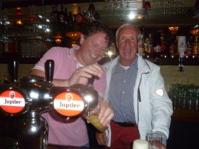 De ouwe en de nieuwe útbaters fan De Walrus ( foarheen dus Van der Wal ) tegare achter de tap. Bas Hollenberg brengt ut gelearde in de praktyk. Simon van der Wal siet ut allemaal lachend an: ' ut binne nòch fan dy kwajonges je...!'