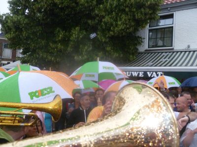Sukrekt teruch fan de Waterpoort. Dêr op ut symboal fan de stad staat de Putkapel te speulen om de Blauhúster Dakkapel múzikale útgeleide te doën richting ut Ouwe Vat.