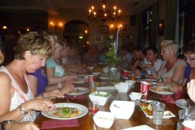 Fraach nyt hoe’t ut kan, mar nòch binnen un kertier stonnen der skalen met un útgebreid asorty fan flees en fis op’e groate tafel, anfuld met patat, appelmoes, slaad en ferskillende sauzen. Niks gyn opwarmde prak, mar hearlek eten, foar elk wat wils! Der komt gyn kaart an te pas! Fermakelek dat de Snekers dêrna hun eigen tafel wear afrúme op professjonele wize, hier ferraad sich de horeka-ervaring dy’t sommegen fan de ploech hewwe toen se nòch an de andere kant fan de tooch stonnen!