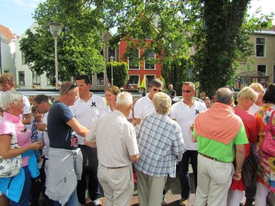 Echte helden hale je in! Un grandioase intòcht op un sonovergoaten Hardseildach! Ut overkwam de Blauhúster Dakkapel gistermiddach. De mannen wisten dat se om 16.30 uur bij de Waterpoort ferwacht wurdden, mar dat se dêrna an board stappe súden fan De nieuwe liefde fan Frans Huitema was tòch wel un ferrassing.