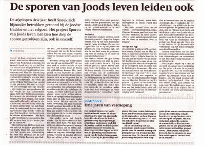 In ut Friesch Dagblad fan gister staat un moai artikel over ut projekt Sporen van Joods leven in Sneek. Ut stuk is skreven deur Erik Betten en het as titel ' De sporen van Joods leven leiden ook voorbij de oorlog '. Omdat de públikasy op twee pagina's staat, is de titel hier boven en hier onder letterlek ferknipt. Wêrfan akte! Oh...jum kanne ut nyt leze? In de bibleteek leit wel un eksemplaar en anders nòch mar even in de boekhandel kieke!