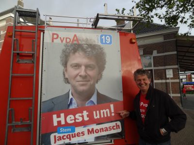 At der één lokale politikus is dy’t ok landelek an de wech timmert is dat Jacques Monasch wel. De nummer 19 op’e kandidatelijst fan de PvdA is útermate aktyf in de ferkiezingskompanje om syn plakje op ut plús in Den Haag feilech te stellen. En ik mut sêge dizze Monasch is gyn doaie pier, dit is un man dy’t um onder ut fòlk begeeft! Oulopen week het de sosjaal demokraat aktyf weest as hulp fan un antal Sneker middenstanders en met ut noadege súkses, want je kanne Jacques der wel bij hewwe.
