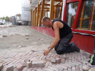 Fandaach, at ik nyt foar de klas staan, siet myn dach der un bitsje anders út, mar ik bin wel de hele dach bezech. Fanmòrren om negen uur begonnen met ut skriëven fan resênsy’s foar de Friesland Post. Tussen de bedriëven deur mailtsjes beantwoarde, aktyf op twitter en nòch wat skriëfputsjes. Fanmiddach de stad in, kontakt houwe met de straat. In dit gefal hast letterlek, namelek prate met de straters dy’t druk bezech binne foar Teater Sneek an de Westersingel. Johan, Mintze en Jarech fan straatmakersbedriëf Cnossen kanne na un week eksakt sêge wat se deen hewwe. Ut wurdt der hartstikkene moai! Prate met minsen in de stad dat mach ik graach doën en nyt allienech prate mar ok lústere: wat leeft der onder ut fòlk!