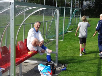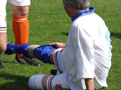 Ondertussen leit Bernhard ut cold-pack al op ut blessearde plak en gaan der meters swachtelferbaan om heen. Dizze kearel weet fan wanten. Ik laat ut allemaal over mij komme en strompel naar de boks. In alle stilte overdenk ik myn persoanleke ellende. Bin ok nyt gek, hew al lang sien dat der ferskillende ploechgenoaten bij ut anskouwen fan myn blessure krekt even te entûsiast infòrmeard hewwe hoe’t ut met mij gaat. Ik sien se denken, ‘ dy binne we de earste weken gelukkech kwyt ’. Ik bin bang dat se gelyk hewwe. O.N.S.1 trener Jan Vlap is nòch un graadsje erger, hij nimt un foto en twittert ut de hele weareld over dat de nieuwe anfoerder fan O.N.S. 7 de anfoedersbaan wat op un apart plak sitten het. Dêr gaat dyn wisselgeld Vlap! Foarlopech is ut 1 – 0 foar dij!