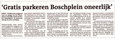 Ut artikeltsje staat in de LC fan gister. Foar alle dúdelekheid: ' Súdwest-Fryslân wilde tienduizend uitrijkaarten weggeven om automobilisten te verleiden hun wagen in de nieuwe garage op het Boschplein te stallen. De promotieactie, die € 20.000 kost, zou in oktober starten. Maar na protesten van de Vereniging Sneker Zakenlieden ( VSZ) is dat voorlopig van de baan. Een maand lang voor niks parkeren is oneerlijke concurentie, vinden de ondernemers.'