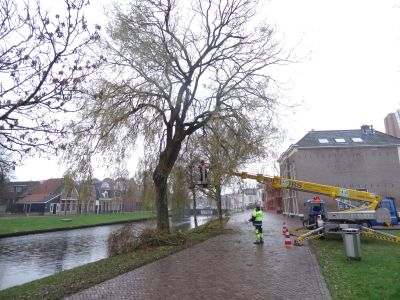 Na W. syn telefoantsje de kuierskoënen an en der op út. Op de Westersingel waren Gerben en syn maat fan de gemeente SWF inderdaad druk bezech met ut rigoreus snoeien fan de treurwilgen. Allemaal nòch werk na anleiding fan de stòrm fan un antal weken leden. Moai om te siën hoe’t sukke mannen an ut werk binne en dat oh su presys doën, niks der mar wat dom in omfege! Ik hew der un antal foto’s fan skoaten.
