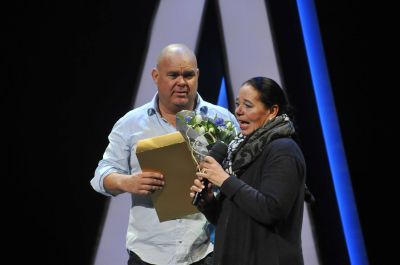 Gisteravend was ik nyt in de gelegenheid om in ut Teater fan Sneek anwezech te wezen. Gelukkech was Jan Douwe Gorter der wel en maakt un antal prachtege foto'sn fan un bysondere happening: binnen 4 maanden het oans Teater al 30.000 besoekers over de floer had! En wat un ' moaie ' júbileumbesoekster, ut had nyt beter kannen: Jolanda Vergonet! Ben van der Knaap ( en personeel ! ) & Jolanda Fan Harte Felisiteard!