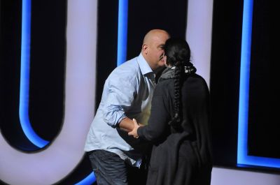 Na het publiek eerst te laten zoeken naar een (niet bestaand) nummertje onder de stoel, riep hij mevrouw Jolanda Vergonet op het podium. De nietsvermoedende eigenares van de dansschool in Sneek, bleek de dertigduizendste te zijn die voet over de drempel van het gloednieuwe Theater Sneek zette. Uit handen van een gekscherende Paul de Leeuw nam de mevrouw Vergonet twintig vrijkaarten, een bos bloemen en een goodiebag met onder andere De Leeuw zijn kookboek in ontvangst.
