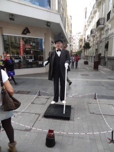 Ut is nou eksakt un week leden. In de hoofdstraat fan Las Palmas staat òf nee sweeft un bebrilde kearel in un swart pak. Ferdommelinkje foar, witte skoenen en dito glasees en un stòk. Ik koekeloer de man fijf minúten an. Gaan deur de knibbels. Loop un rondsje om ut 4kant, op um self un prestasy! Ik begryp der niks fan: hoe het dizze straatartyst dat? Leunt hij op’e stòk? Leit der un onsichtbare plaat tussen man en trotwaartegeltsjes? Ik kan niks gewaar wurde. Wat un apart gesicht. Ik wurd besoademieterd wêr’t ik bij staan! Seuven dagen na dato hew ik ut antwoard nòch nyt. Su nou en dan tover ik ut beeld wear foar mij. En úteraard hew ik de foto nòch!