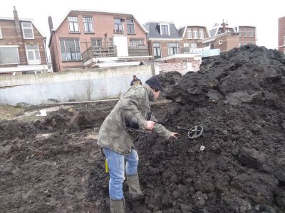 Un frijwilleger fan Archelogisch Steunpunt Sneek was ok druk bezech met ut speuren naar metalen foarwerpen in de modderbult an de Julianastraat.